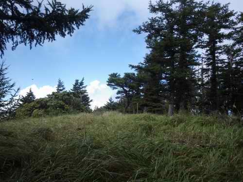 赤土上の伏石部を通過して、登山道を短くたどって、緩い斜面が緩んだところのNo1杭の向こうに山頂標柱がたっている。