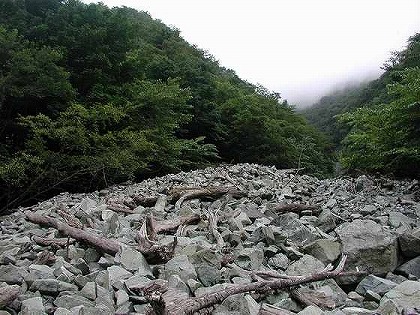 その砂防堤を 「これで終わり」 と越えると大量の石が山積みされたモレーンのように盛り上がった広い河原となる。