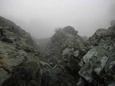 傾斜が45度以下の緩やかな岩場なら、今までの砂と小石のザレ場よりは岩により足元が安定して登高もはかどるのだが、傾斜がきつく掴む一つ一つがボコッと引き抜けるような状態だし、スタンスだって体重をかけるとグッググと崩れだすような脆弱な岩質だから、一歩一歩の動作がデリケートになるのは避けようもない。