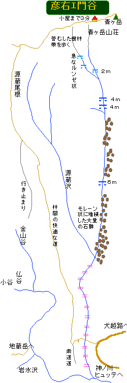 モレーンの脇から源蔵小屋谷が左に水量比1:1で分かれる。