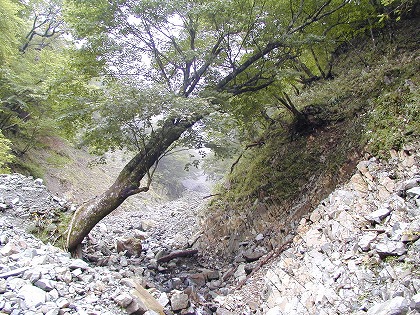 大滝沢への分岐になる雷平付近は流水に洗われた跡が残り、その上に小さな土石や流されてきた枯れ葉が積み重なっていて、普段見慣れた景色とは少し違う。