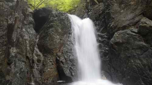 孫左右衛門沢の大滝を見て、対岸下方の緑の中に小洞沢大滝の水がはぜて飛んでいる。