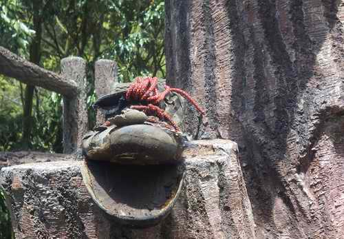 公園橋に降りる所の登山看板に乗せた靴