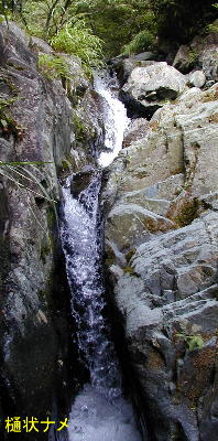 黒っぽい岩のナメ状の滝3m、2m
