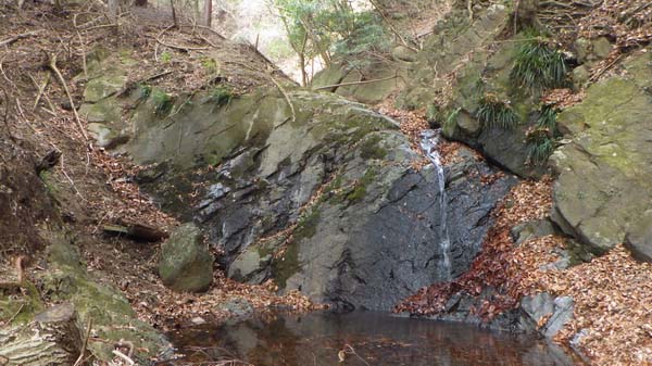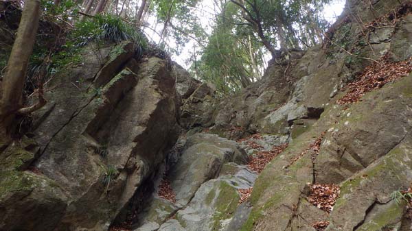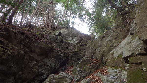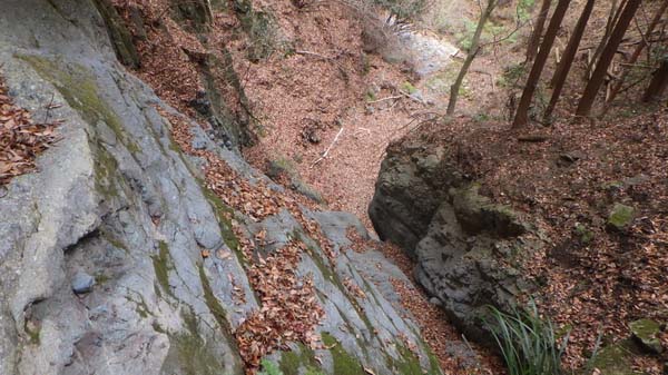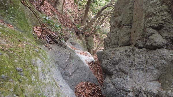こちらの方は、岩がおおざっぱなので岩と岩の間に足先が乗せられて楽だったが、掴んでいるブロック大の岩がそれごと抜けてしまわないかとの思いが強くて、でもそうなったとしても、下には落葉が厚く積んである滝壺だ。