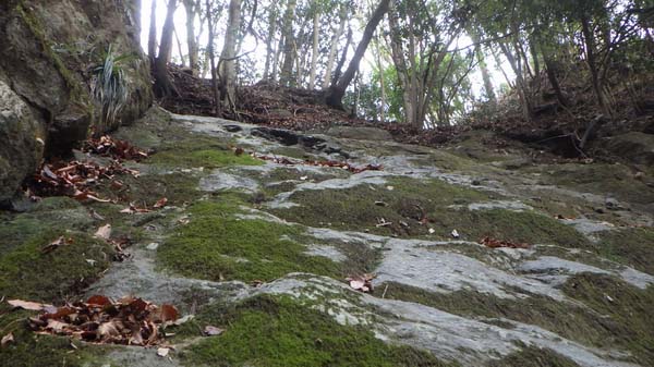 ただ3m上がったところから丸溝の間は凸凹が少ない膨らみを持った岩肌で仕上がっていて、そこに一歩を置かないと丸溝底に届かない。