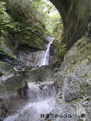 林道上から樹木の枝越しに沢をのぞき込むと20mほど先に6mほどの滝が見え、その奥にもゴルジュ状が連なっていて、奥になにがあるのかなにやら楽しめる雰囲気が満ちている。