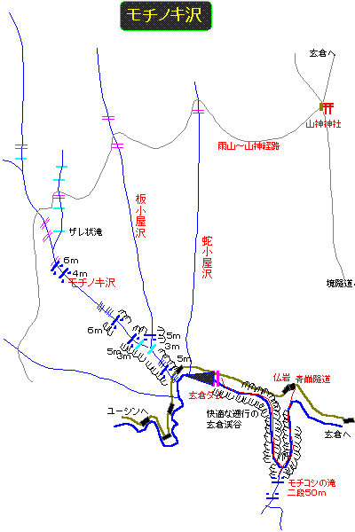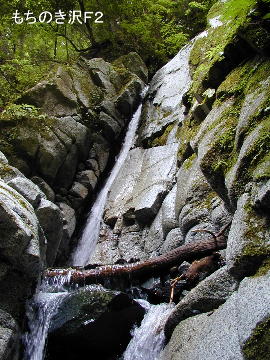モチコシの滝は、玄倉川が深い逆U字を描く底に当たる部分に玄倉川の激流によって岩が穿かれ切り裂かれた結果として岩壁に穴がこじ開けられ、滝から落ちた勢いがまだ止まり切らない性急な流れの間口3m程のゴルジュ状が山の奥の襖を開けたかがごとくに出現する。