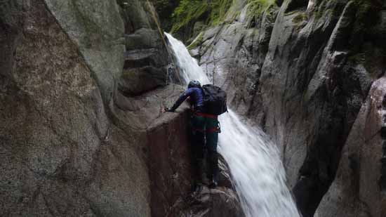右壁スラブを残置の二個所の捨て縄を補助にして登る滝である。