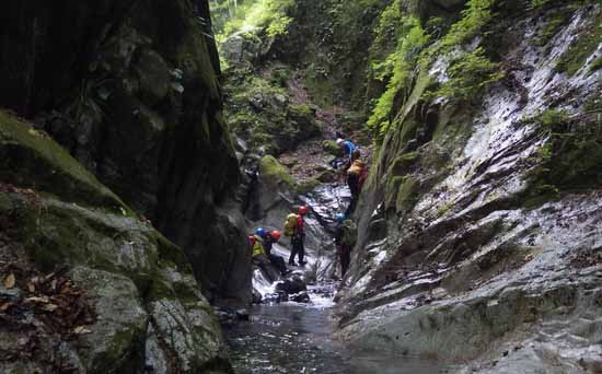 右岸を3m上がったところでは大勢が次の動作の準備をしていたが、脇を通り抜けさせていただき、上に出て、そこから直ぐにスラブ滝の落口に降りる。