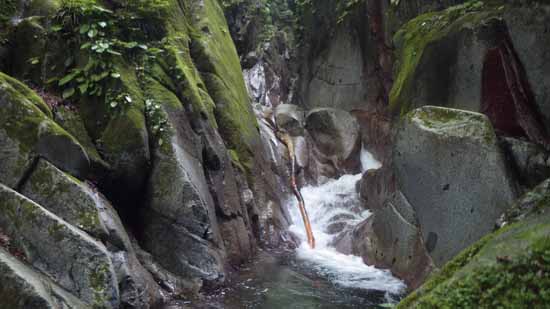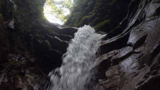 そこは3m上の小滝から下のスラブ滝落口に向かって水流がまとまったまま曲がって続いているところで、水量が多いときには、左右の岩で狭ばまった水が、竜の口から出る火炎のような勢いを持っていて、直に水圧を体に受けると、必死に岩にへばりつく力が引きはがされてスラブ滝の下まで一気に押し落とされるようにも厳しくもなる。