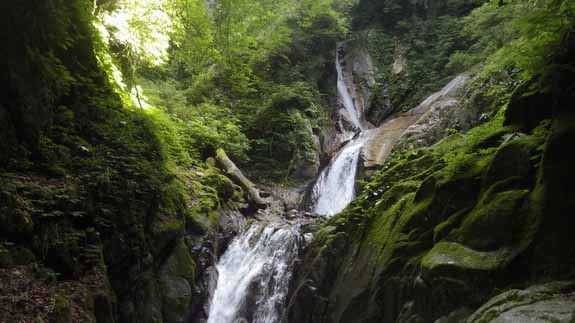 何れも深い釜を持っていて、一つめは釜に入らずに、左の溝状を苔に滑りながら登り、二個目は一端巻いてから、左岸側から釜に降りていって登り直す。