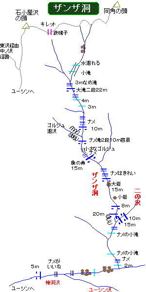 だから同角沢に比べても岩のヌメリが多い「ザンザ洞」のナメ状を駆けるように歩くわけには行かないし、まして丸みのかかったスタンスに乗る場合など滑っても絶対に止まれる自信の持てるホールドを探して右往左往する事になる。