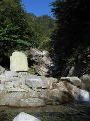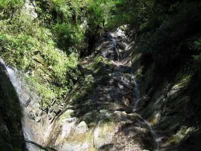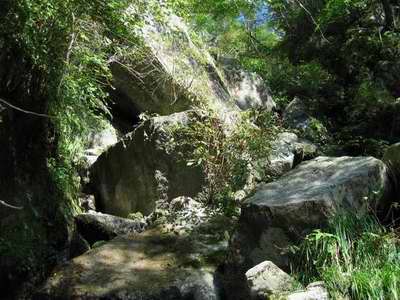 まっ、焦ることなく、慎重に行けばどうってことないさと大岩の連続を三個四個と越え、続く4m滝を登って一一息つくことになる。