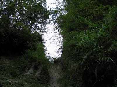 これらのものが一切無いとすると岩肌はすべすべしていて登りにくそうだが、現に上から垂れ下がっている倒木には手応えがあり、こいつも手がかりにして登ると少しだけ脇にそれて沢に戻るのに躊躇してしまう一歩だけを気を付ければ良い滝である。