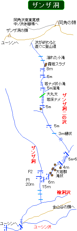 小滝を乗り越え、流れを左にして踏み跡を追い150m程進むとザンザ洞のF1が見えてくる。