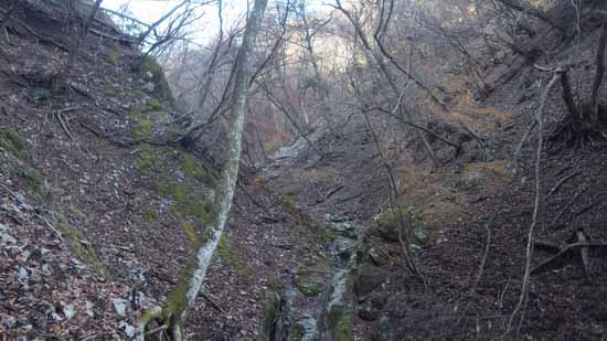 これよりも、南に三百mほど行った宮ヶ瀬尾根の最低鞍部(最初に書いた経路の乗越でもある)からなら50mの下降で沢に降りられるはずだ。