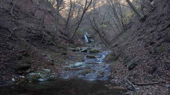 そこで左岸の尾根を15m程登り、そこから尾根を外して10mほど沢に沿って進み、木の根っこを頼りにして5m降ると3mcs滝の上流側10mで沢に戻る。