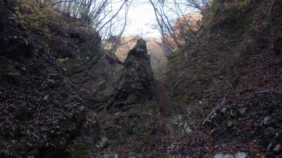 一息ついたら沢に降りて対岸に渡り、10mほど露岩の間を行き、降りたら (道路肩用の丸太は形が残っていたが木そのものは腐ってしまっている)