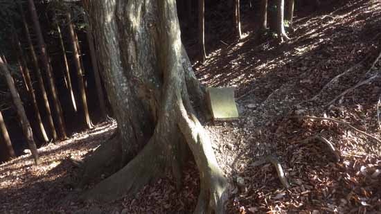 尾根上に張られた古い鉄線柵を踏みつけつつ、そして降りきった鞍部の樅の木の下にあるのが石祠だ。