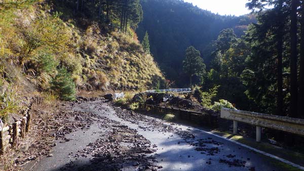 境川林道について言えば、例年、この時期に狩猟対応か何かは分からないが路面清掃(路面の枯葉&石ころ除去)が行われるのだが、今秋について言えば、僅かに車の轍跡が分かる程度である。
