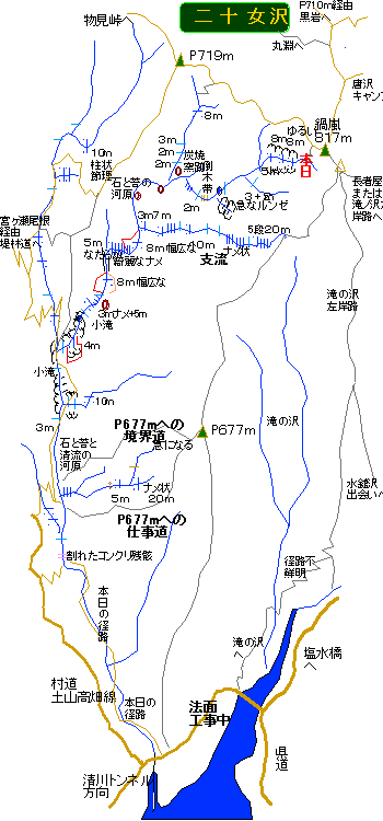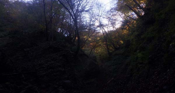 止まればよいが、スリップ途中停止の保証はついてなくて、たいていそう言うところでは沢床まで10m位はあり、前にも一度宮ヶ瀬尾根最低鞍部からハタチガ沢に移行した際に採ったルートだが、そこを無事に通過するのはなかなかどうして難儀なのだ。