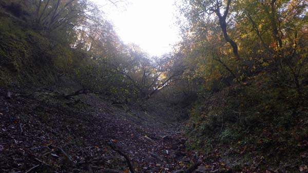 でも思うとおりには歩けてはなくて、途中に立入禁止看板が立っている所で主尾根を外すつもり無くとも、三個ある立ち入り禁止看板の左側の小尾根に入ってしまったらしく、沢床に到着する手前の急傾斜面にビビる。
