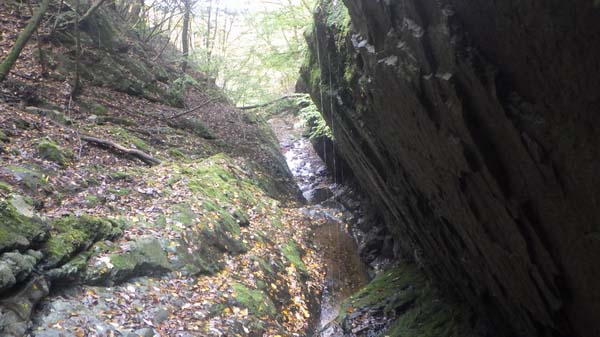 そこで下降方向の間違いに気がつき、P719mからの下りの尾根の何処で踏み違えたのかを自問自答しつつ、根っ子に掴まるようにして斜面を下り沢床に立った。