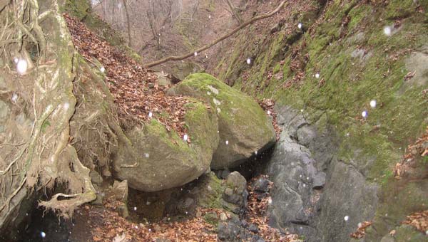 岩面に当たって跳ねる音が小さくして、霙かと考えている間もなく全部が白い玉模様(雪)に変わった。小黒丸だった水跡は白に変わり、瞬く間に小さな岩の窪みに溜まり始めた。