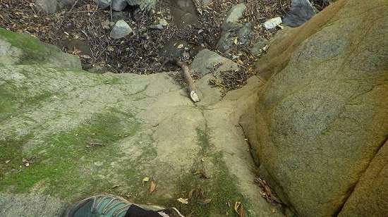 出だしの滝はスラブ岩でバランス感覚さえ良ければ、あるいは落口縁に手が届けば登れそうなのだが、