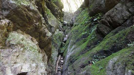 中央は体が入るか否かの狭さだが、大滝やハングでは無く、小滝の間に足を置く平坦がある連続小滝だ。