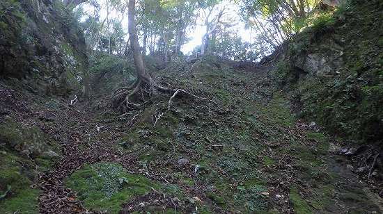 でも道そのものは手が入れられたようで、丸太階段を覆っていた土埃が払われ、横木が表面に出ていた。