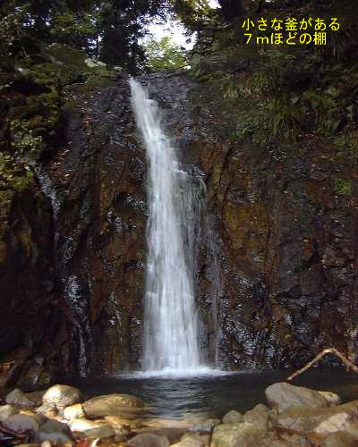 沢通しに行き、蜘蛛の巣が張っている小滝を3個ぐらい過ぎ、ヌメヌメ2mは中央のがっちりしたホールドを掴んで、水の中をさっと登る。釜を持った2mを過ぎて、次は小さな釜がある7mほどの棚となる。