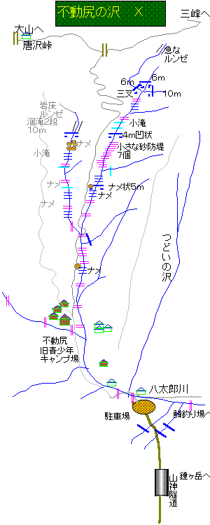 自宅6:40〜谷太郎川先の駐輪(車)場7:20〜無名の沢F1 7:45〜F2 8:05〜不動尻8:40〜谷太郎川本流〜登山道10:05〜不動尻10:45〜駐輪場11:20〜自宅11:50 2002/09/08 曇り後晴れ