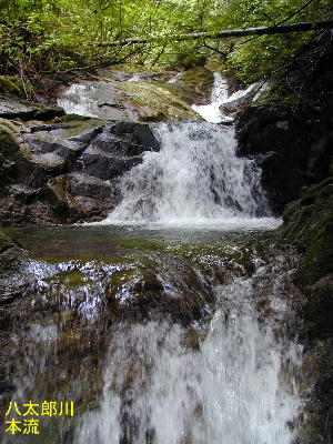 右に小沢を水量比5:1程で分けると幅広4m程のナメ状滝。