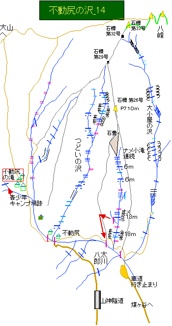 不動尻キャンプ場跡まで歩いて、その手前の橋から二つに分かれる流れのうちの左の沢の右岸の仕事道に入り、10分ほどで目指す滝に着く。