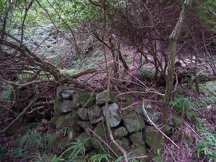 滝を登り切った直ぐ上は石積み堤になり、それは右の流れの石積み堤と連なり、中央上には炭焼き釜が半分崩れて埋もれている。
