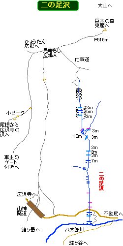 広沢寺から不動尻まで続く道路名が、この沢の名前を取って「県営二の足林道」と付けられているいうこともあり、そうならば、それなりに顕著な地形があるかと想像されるが、林道から見ると砂防堤が二個と水がチョロチョロと流れるだけの貧弱なもので、名前が示す 「二の足」 を踏むのを躊躇うほどの険悪性を秘めているとは見えない。