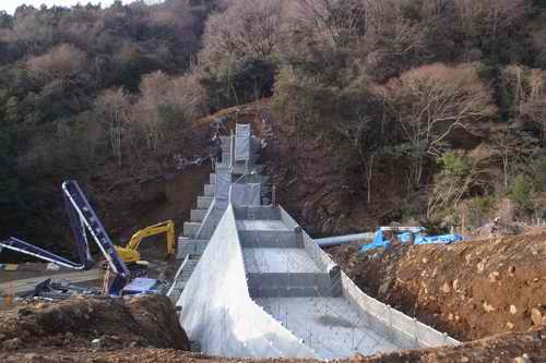 大平石切場下の石工の廃屋民家前は大型砂防堤工事中だ。