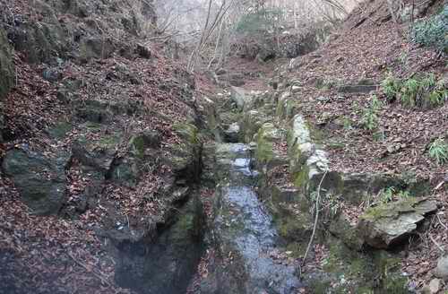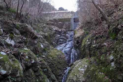 滝の落口は林道から垂直に降りるコンクリ製の高さ7mの法面に続いていて、水量が少ないのと、落口からのコンクリート製垂壁と、その上のガードレールが人工の城壁のように見えているから、これ全体を滝と称して良いかどうか迷うが、それでも厚かましくも言い切れば30m近い大滝といって良いだろう。