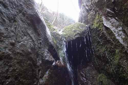 二の足林道から一旦谷太郎川底に下って林道下の滝(崖)を見上げる