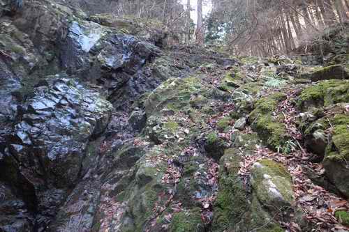 鐘ヶ岳から下ってきて、写真右上の大平石切場跡との石碑があった付近の付け替え道に降りた。