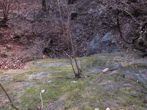 スラブはもう少し続き、屈曲点の立木を掴んで上をうかがうと平版な岩場の中に沢は消えて無くなる。