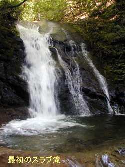 ナメ滝は傾斜度45゜程度で登高差10から15m、長さ20m程度で上部で2段に別れている。
