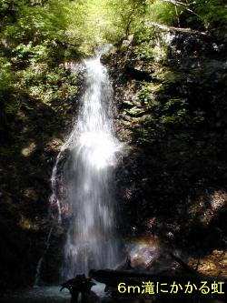 6m滝は垂直で飛び落ち、水煙に陽があたって暗い岩肌をスクリーンにして鮮やかなしっかりとした虹を描く。