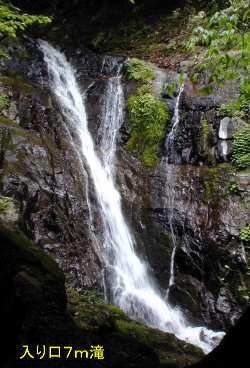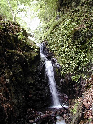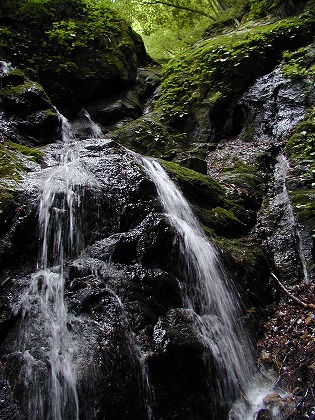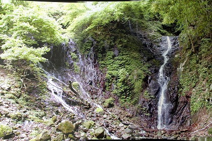 山を下った水辺の広場(キャンプ場の奥1km程の所)と称する平坦地の奥に20m程の立派な滝が一つと小滝がある。