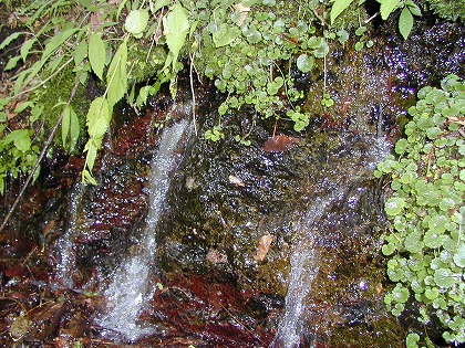 周囲を露岩に囲まれ、胸下高さの数カ所の露岩から水を吐き出し小砂利に吸い込まれる水の広場である。