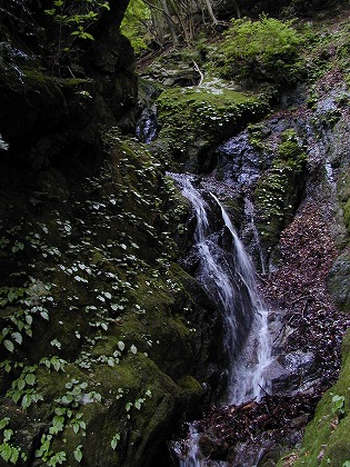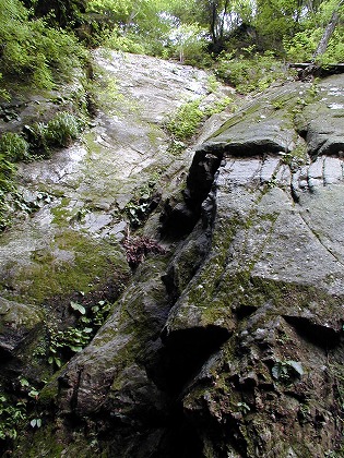 登山道からはこの部分への入り口のナメが見えるだけであり、滝を見るためにはすこし薮をかき分けるか、あるいは山裾の登山道から林間を下る必要がある。