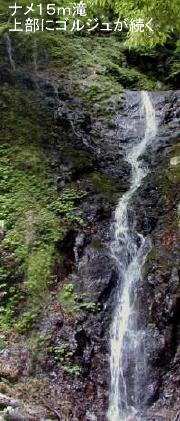 続けて右上する凹状の岩溝がある15m滝*2である。