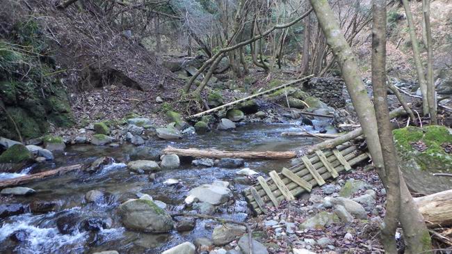 途中にかかる徒渉橋は全部流れているし、流水に洗われた砂の河原は石がゴロゴロしていて山斜面に入る登山道を隠し、それを見過ごし行き止まりとなった堤防を越えるのに精一杯で、軽くハイキング気分など味わえないままで不動尻に着く。